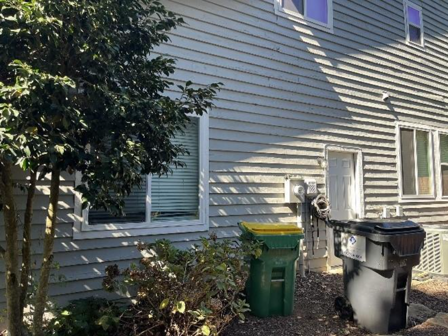 While it may be hard to see in this photo because of the lighting, the paint is flaking off slightly in the siding. There aren’t any huge pieces coming off, but in the shadow you can see dark spots peeking through the beige paint.