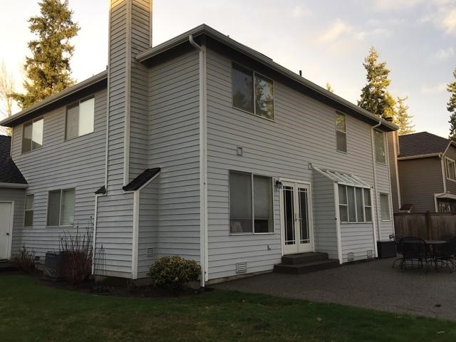 Our crew removed all of the previously damaged siding material from the entire exterior of the home and installed James Hardie Color Plus siding with a body-color of pearl gray and trim color of arctic white. We then replaced 2 windows on the back kitchen wall with a slightly smaller Ply Gem Pro series in white vinyl to fit the frames better. Finally, we replaced the side of the garage door wraps with Boral material to seal the edges for future protection.