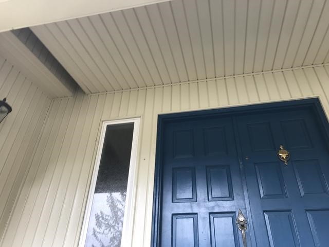 Our crew safely removed all of the previously damaged materials and installed James Hardie Color Plus 8 1/4 siding in the body color of Aged Pewter and the trim color of Arctic White. The difference was immediately noticeable by our customer and their neighbors, as it completely updated the exterior of the home and increased the overall curb appeal. We also applied a Color Plus paint job to the soffits, fascia, gutters, and garage doors to match the new exterior style and make it flow beautifully. To ensure protection against the elements, we installed James Hardie Soffit to the entryway porch, James Hardie Fascia to the back gable and finally wrapped James Hardie Panel and Cap with metal flashing to the beams on the gable. All of these small improvements will make a huge difference in protecting our customers, their families, and the structure for years to come.